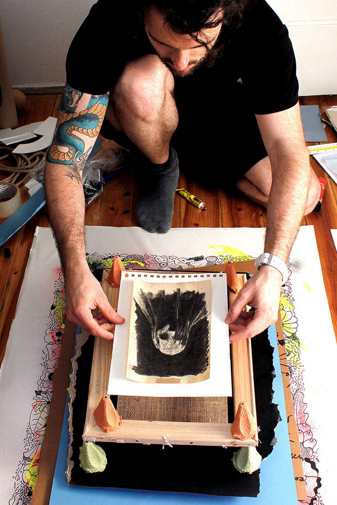 Instinctively he put layer on layer, cutting paper, tearing up eggshell-packages. He wouldn’t just put paper flat on the existing plane. Instead he put little objects in between, pads, cardboard or other stuff he could find, so the layers would “float on top of each other.” Soon he had built up a little throne for Lukas’ drawing. He placed it on top of the little pyramid and took a picture, to see what he had done.